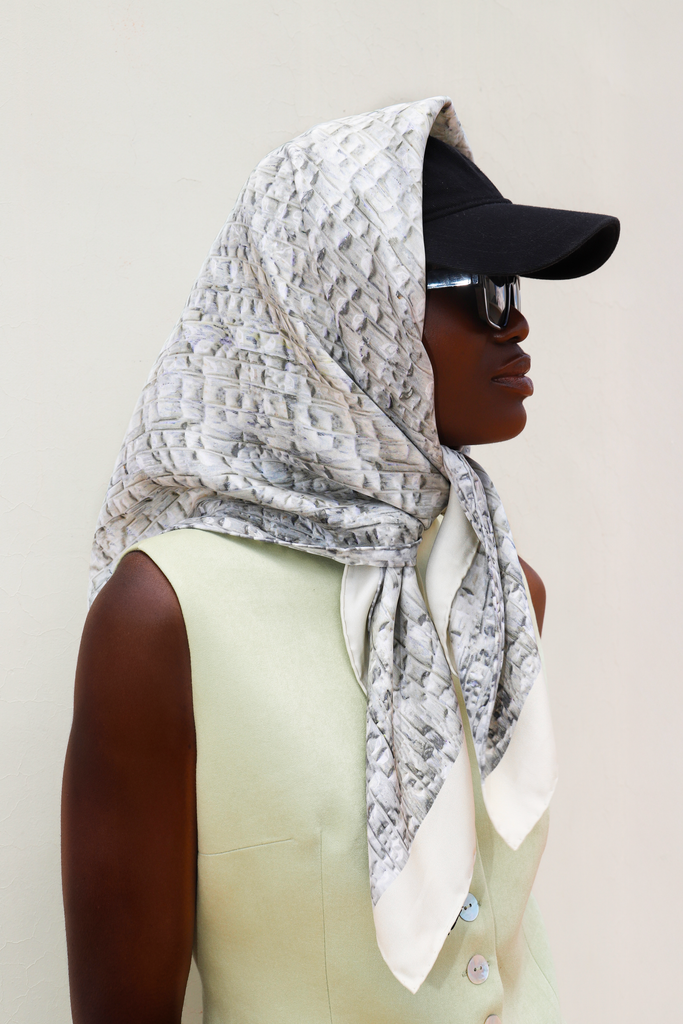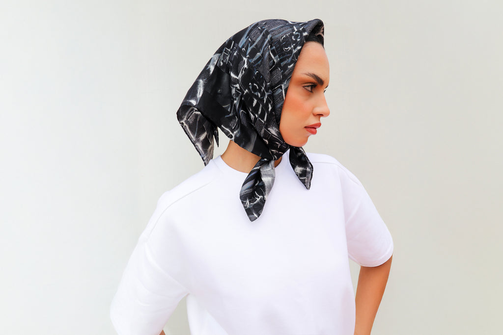 En tant qu'accessoire unisexe, le carré de soie Amel Batita se porte aussi bien autour du cou, qu'en ceinture, en bandeau ou en turban pour toutes les saisons.