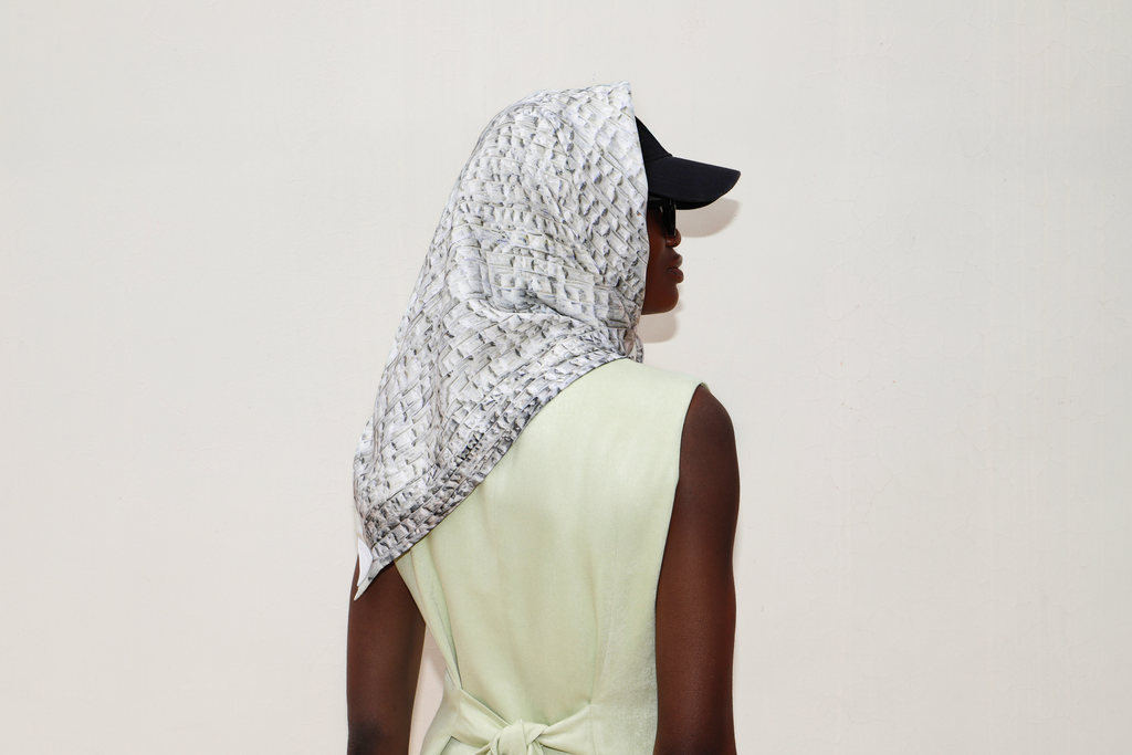 Le carré de soie LALUT est signé Amel Batita, avec un marquage à chaud sur une chute de cuir blanc cousue à l'angle. Crée à Paris, ce carré de soie est le fruit d'un savoir-faire innovant : l'artcycling.