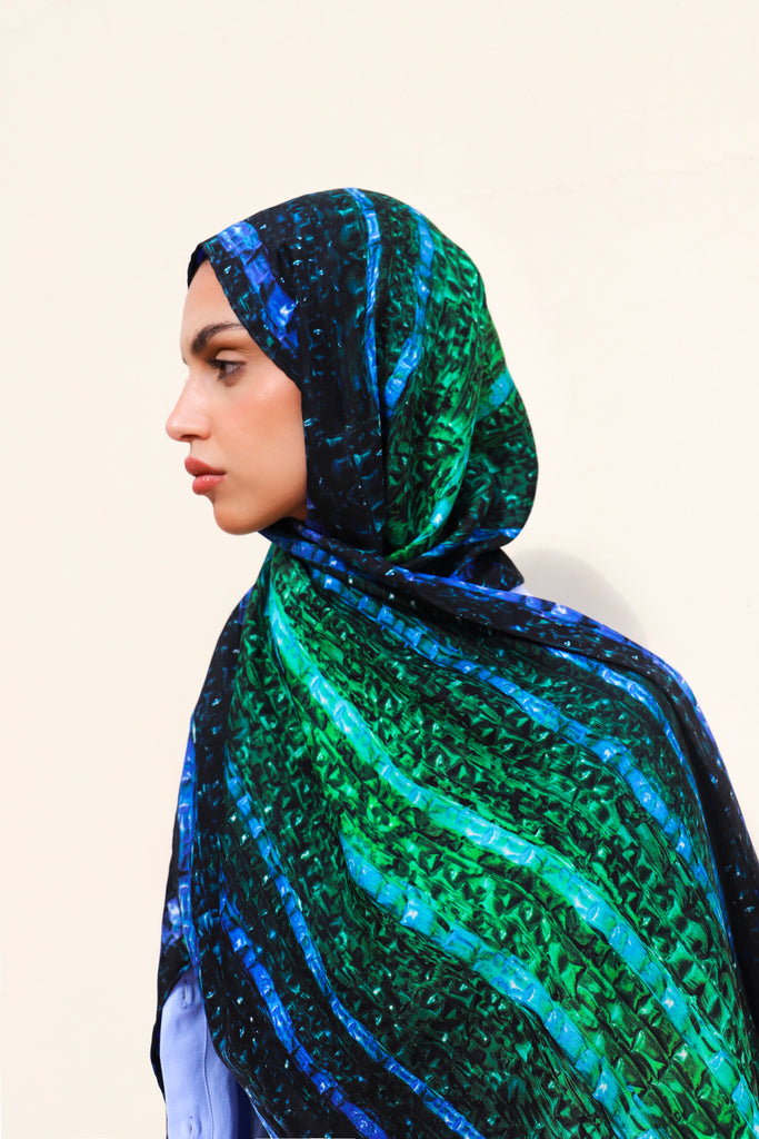 Bien plus qu’un accessoire, cette étole incarne l’alliance parfaite entre l’art et la mode, dévoilant le motif unique Brocot. Une texture créée à partir de plastique recyclé et transposée sur une toile originale par Amel Batita, artiste et designer de pièces d’exception en soie.